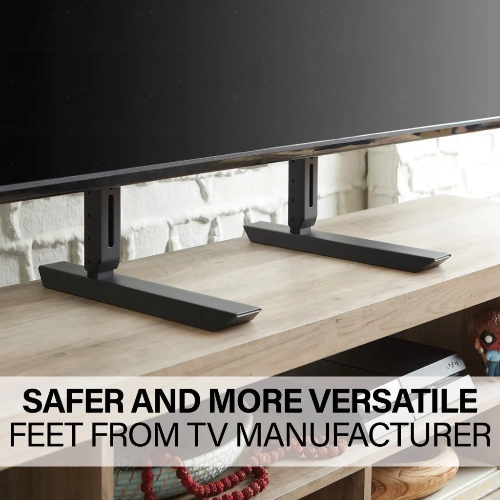 The SANUS Accents Universal TV Feet (ARTVF1) works on all surfaces, and is a substantial improvement over the stands that are traditionally included with TVs. The stable footprint and anti-slip pads is optimal for TV stability for furniture with shallow depth. The TV feet give 8″ of height adjustment to accommodate a soundbar for a sleek look and perfect set up.