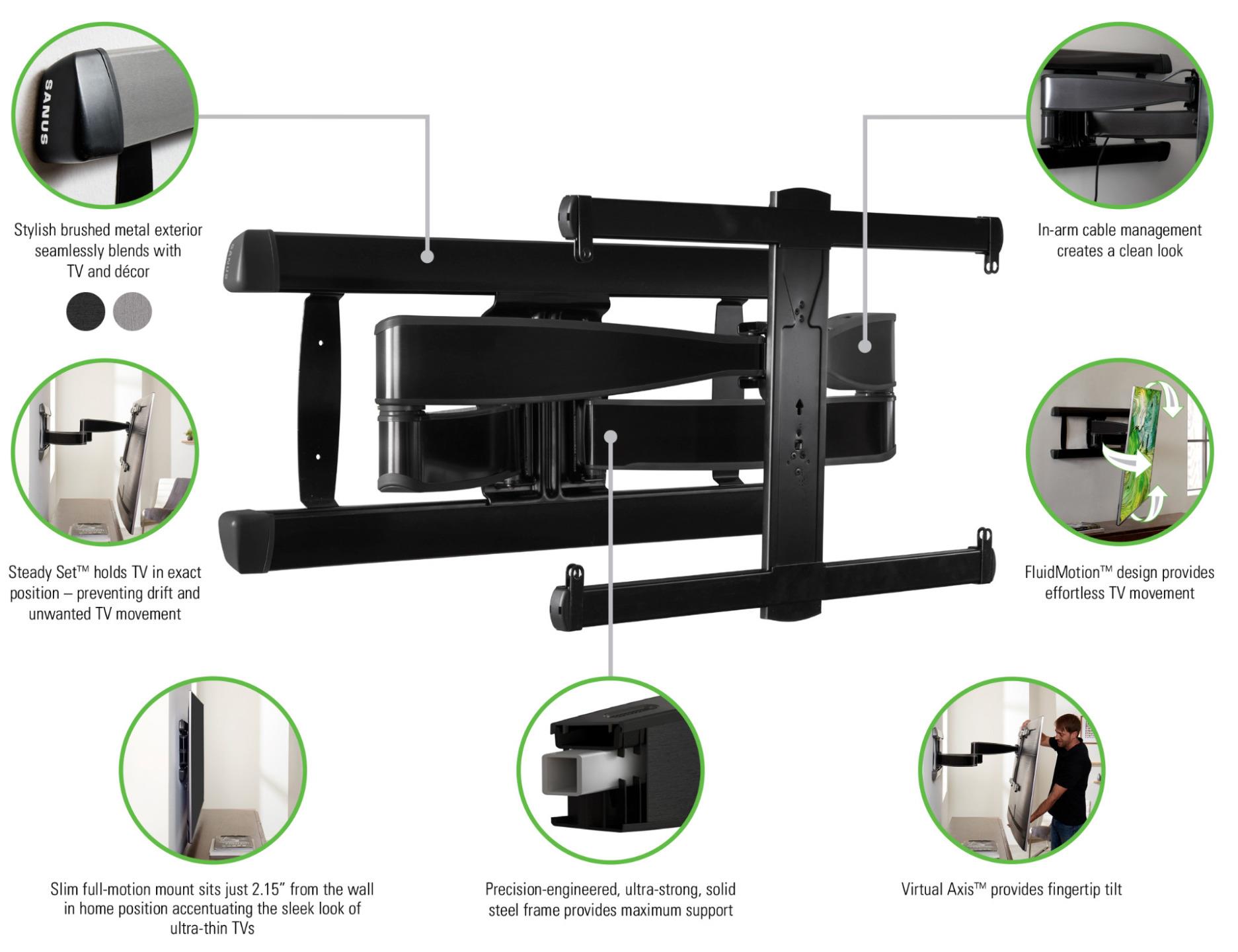 Sanus is the leading choice for AV installers and offers superb quality with a 10 year warranty! YES 10 years. This is your guarantee of the quality of manufacture and is why Sanus are priced at the high end. Would you trust your expensive TV with a cheaper brand? I know I wouldn’t. Product Description High-end performance meets high-end design The Advanced Full-Motion Premium TV Mount is a next-generation mount that incorporates the TV into a home in an entirely modern way. Featuring a stylish brushed metal finish and slim profile, the Advanced Full-Motion Mount complements the sleek look of today’s TVs. Beneath the mount’s exterior is a precision-engineered, ultra-strong solid steel frame – ensuring the TV stays securely in place. Expertly engineered with FluidMotion™ design, the Advanced Full-Motion Mounts provide unparalleled smoothness – allowing for effortless extension and swivel. The mount’s Steady Set™ functionality holds the TV in place – eliminating drift and unwanted TV movement. The simple and intuitive design guarantees a quick and hassle-free installation. Features: FluidMotion™ design for effortless TV movementSteady Set™ holds TV in preferred positionDesigned with Ultra-strong precision, crafted like a piece of artGet the best view from any seat in your roomSlim FollowThru™ in-arm cable management for easier cabling & clean lookUp to 15º of tilt and 57º of swivel left to right for ultimate viewing flexibilityLateral shift for perfect TV positioningDecorative covers conceal wall plate for a clean lookEasily level TV after installationSafety-tested, UL-listed and features a 10-year limited warrantyAll hardware and drilling template included Specifications: PRODUCT DIMENSIONS (W X D X H)85.85cm x 5.46cm x 44.93cm TV SIZE / WEIGHT CAPACITY56.7kg MINIMUM DEPTH FROM WALL5.46cm EXTENSION71.12cm MOUNTING PATTERN (VESA)Minimum 200 x 200Maximum 600 x 400 PACKAGE DIMENSIONS (W X D X H)92.41cm x 40.89cm x 9.78cm PACKAGE WEIGHT17.8kg User Manual Technical drawing