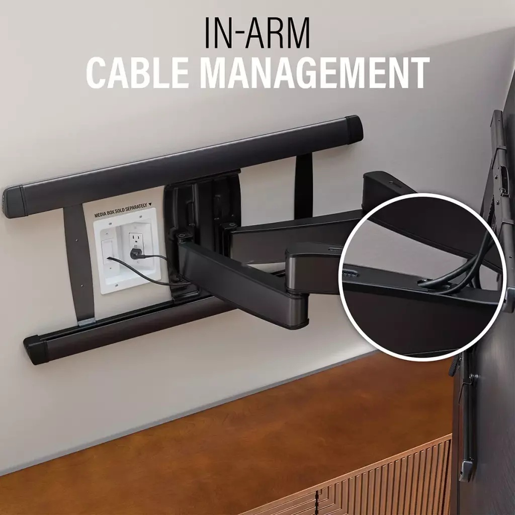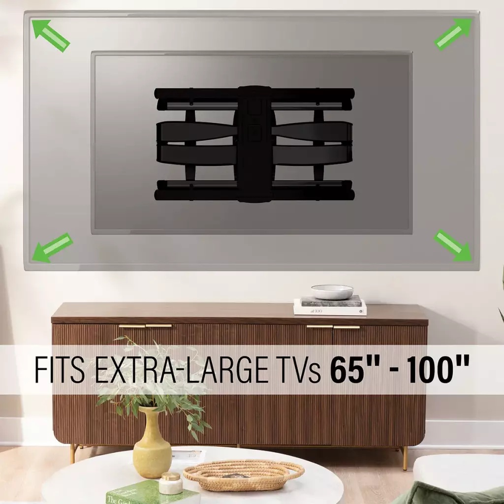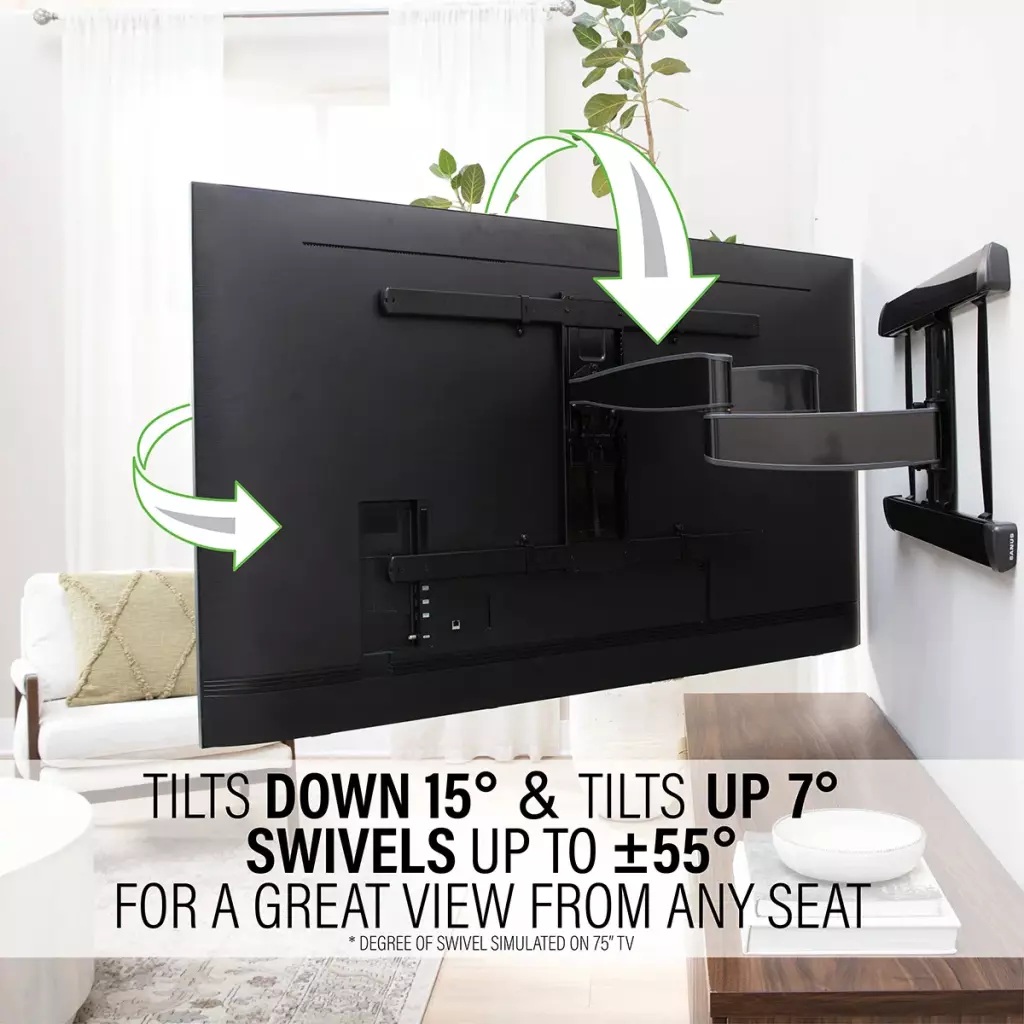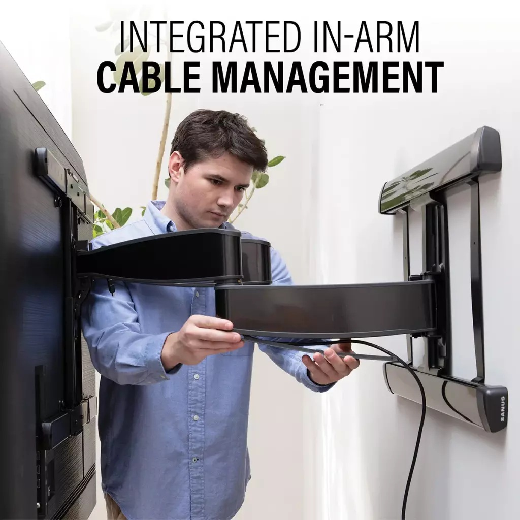 Description – BEFORE BUYING PLEASE MAKE SURE YOU UNDERSTAND HOW BIG & HEAVY THIS MOUNT IS The VXF830 Full-Motion Premium TV Mount is designed to accommodate 65″-100″ TVs while blending seamlessly with modern décor. Featuring a sleek brushed metal exterior and a solid steel frame, it ensures maximum support and durability. With its advanced FluidMotion™ technology, this mount provides effortless extension, tilt, and swivel for an optimal viewing experience. At just 2.61” from the wall, it offers a streamlined look, perfect for today’s extra large TVs. Product Features – Sleek, Modern Design – Brushed metal exterior blends seamlessly with TVs and décor for a refined look.- Ultra-Strong Support – Solid steel frame ensures maximum durability and securely holds TVs from 65″ to 100″.- Smooth Adjustments – Advanced FluidMotion™ and Virtual Axis™ Fingertip Tilt technology provides effortless extension, tilt, and swivel for optimal viewing.- Low-Profile Depth – Positions TVs just 2.61” from the wall, creating a streamlined and stylish appearance.- Reliable Stability – Steady Set™ functionality keeps the TV securely in place with no drifting or unwanted movement.- Easy Installation – Simple, intuitive design allows for hassle-free setup in about 30 minutes with all hardware included. Tools You Will Need For Installation – 1/8″ Drill Bit- 1/4″ Drill Bit- 3/8″ Drill Bit- 7/16″ Socket Wrench- 1/2″ Socket Wrench- Allen Wrench- Electric Drill- Level- Pencil- Phillips Head Screwdriver- Stud Finder- Tape Measure The Details Product Brand: SANUSModel Code: VXF830UPC Code: 793795540102 – BlackProduct Width: 37.51″ / 95.28cmProduct Height: 24.28″ / 61.67cmProduct Depth: 2.61″ – 30.50″ / 6.63cm – 77.47cmTV Size Range: 65″ – 100″ / 165.10cm – 254.00cmMaximum TV Weight: 175lbs / 79.38kgUniversal Mounting: Yes | 200 x 200 through 900 x 600Tilt: 5° / -15°Swivel: 55° / -55°