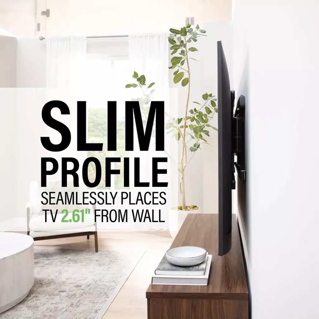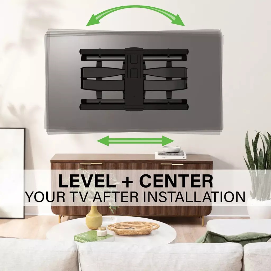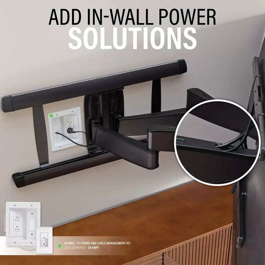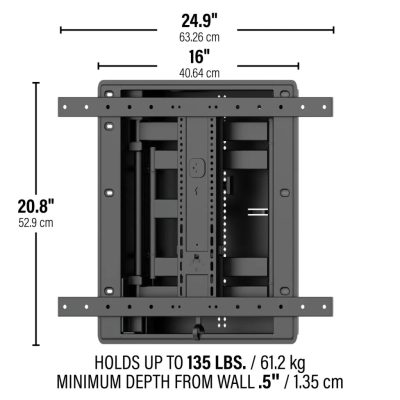 Description – BEFORE BUYING PLEASE MAKE SURE YOU UNDERSTAND HOW BIG & HEAVY THIS MOUNT IS The VXF830 Full-Motion Premium TV Mount is designed to accommodate 65″-100″ TVs while blending seamlessly with modern décor. Featuring a sleek brushed metal exterior and a solid steel frame, it ensures maximum support and durability. With its advanced FluidMotion™ technology, this mount provides effortless extension, tilt, and swivel for an optimal viewing experience. At just 2.61” from the wall, it offers a streamlined look, perfect for today’s extra large TVs. Product Features – Sleek, Modern Design – Brushed metal exterior blends seamlessly with TVs and décor for a refined look.- Ultra-Strong Support – Solid steel frame ensures maximum durability and securely holds TVs from 65″ to 100″.- Smooth Adjustments – Advanced FluidMotion™ and Virtual Axis™ Fingertip Tilt technology provides effortless extension, tilt, and swivel for optimal viewing.- Low-Profile Depth – Positions TVs just 2.61” from the wall, creating a streamlined and stylish appearance.- Reliable Stability – Steady Set™ functionality keeps the TV securely in place with no drifting or unwanted movement.- Easy Installation – Simple, intuitive design allows for hassle-free setup in about 30 minutes with all hardware included. Tools You Will Need For Installation – 1/8″ Drill Bit- 1/4″ Drill Bit- 3/8″ Drill Bit- 7/16″ Socket Wrench- 1/2″ Socket Wrench- Allen Wrench- Electric Drill- Level- Pencil- Phillips Head Screwdriver- Stud Finder- Tape Measure The Details Product Brand: SANUSModel Code: VXF830UPC Code: 793795540102 – BlackProduct Width: 37.51″ / 95.28cmProduct Height: 24.28″ / 61.67cmProduct Depth: 2.61″ – 30.50″ / 6.63cm – 77.47cmTV Size Range: 65″ – 100″ / 165.10cm – 254.00cmMaximum TV Weight: 175lbs / 79.38kgUniversal Mounting: Yes | 200 x 200 through 900 x 600Tilt: 5° / -15°Swivel: 55° / -55°