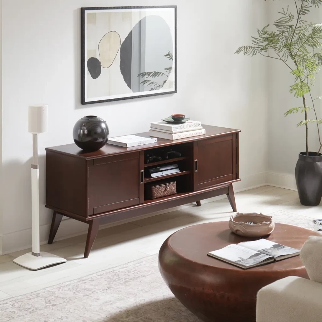Height-Adjustable Speaker Stand For Sonos Era 100™ The SANUS Height-Adjustable Speaker Stand designed for Sonos Era 100™ offers 17″ of effortless sliding height adjustment, cable management and a sleek design. This adjustable stand is sure to deliver optimal audio performance regardless of your listening needs. Constructed of durable steel and extruded aluminum, this not only resists wear, but also perfectly complements the aesthetics of the Sonos Era 100™ for a sleek, seamless look. Perfect for use in any setup, be it home theater, surround sound, or ambient listening. For a cable-free look, our Press Fit™ cable management technology secures and conceals cords down the back of the stand. Assemble easily in 15 minutes with a Phillips screwdriver, this sleek stand will help get you the perfect sound for your space. What’s in the box? Pillar (1), Base (1), Lock Washer (2), Pillar Screw (2), Isolation Pad (4), Carpet Spike (4), Jam Nut (4), Top Bracket (1), Speaker Bracket (1), Speaker/Bracket Screw (2), Securement Screw (1), Release Trigger (1), Cable Management Clip (4) Product Features: Seamlessly blends with Sonos Era 100™ wireless speaker17 Inches of height adjustment for optimal listening (25.74 – 42.74 inches/ 65.38 – 108.56 cm)Integrated cable management for a sleek lookIncludes rubber feet & height adjustable carpet spikes for any floorPerfect for any setup: Home theater, stereo pairing, or ambient listeningSturdy, oversized base helps prevent tip in any direction Tools You Will Need For Installation: Phillips Head ScrewdriverEasy, 3-step assembly takes just 15 minutes Product Width: 10.90″ / 27.69cmProduct Height: 25.00″ / 63.50cmProduct Weight: 13.53lbs / 6.14kg Also available as a pair