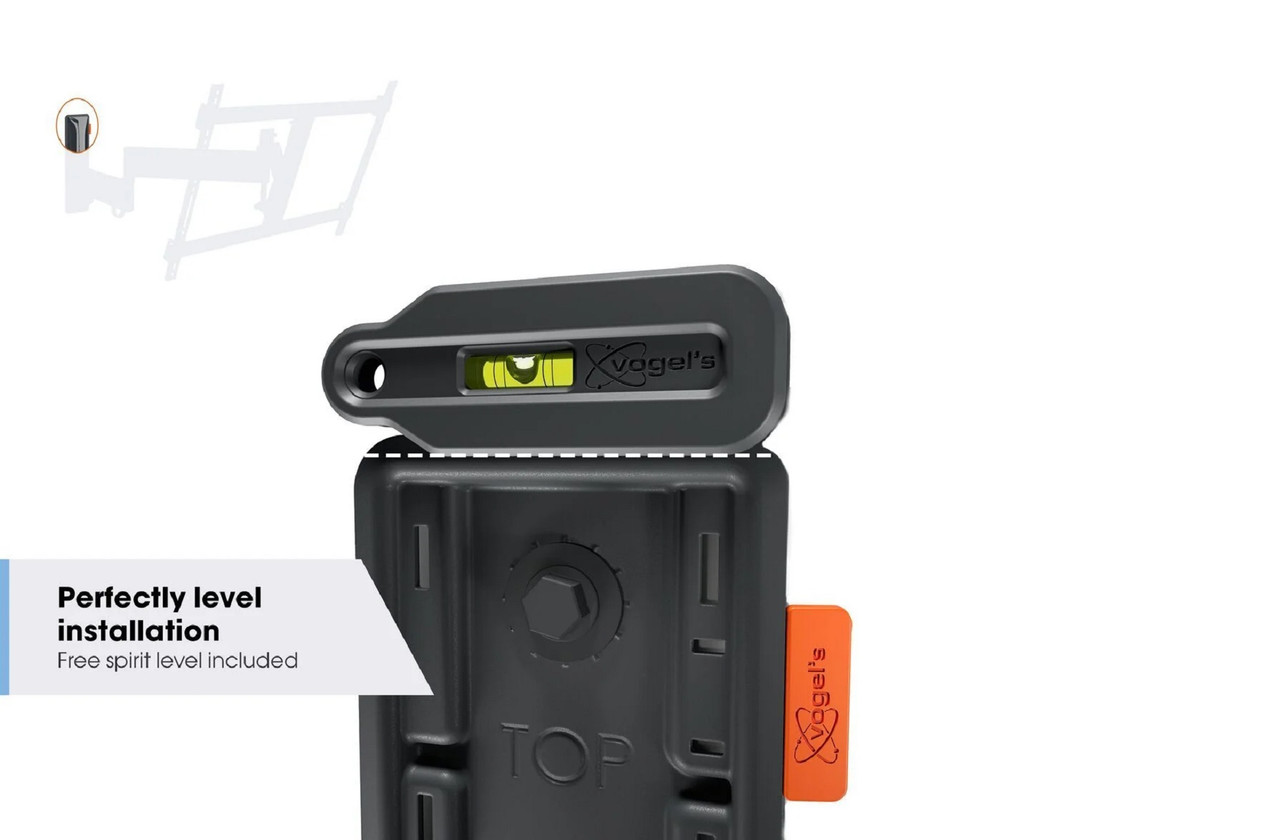 The COMFORT Full-Motion+ TV wall mount is easy to install. A drilling template, screws, Fischer® DuoPower plugs, cable ties and a spirit level are already included in the packaging. With our free DrillRight™ AR App, it’s easy to mark out the first drill hole. Is your TV mounted a bit crooked? You can also adjust the level of the TV after mounting it on the wall.