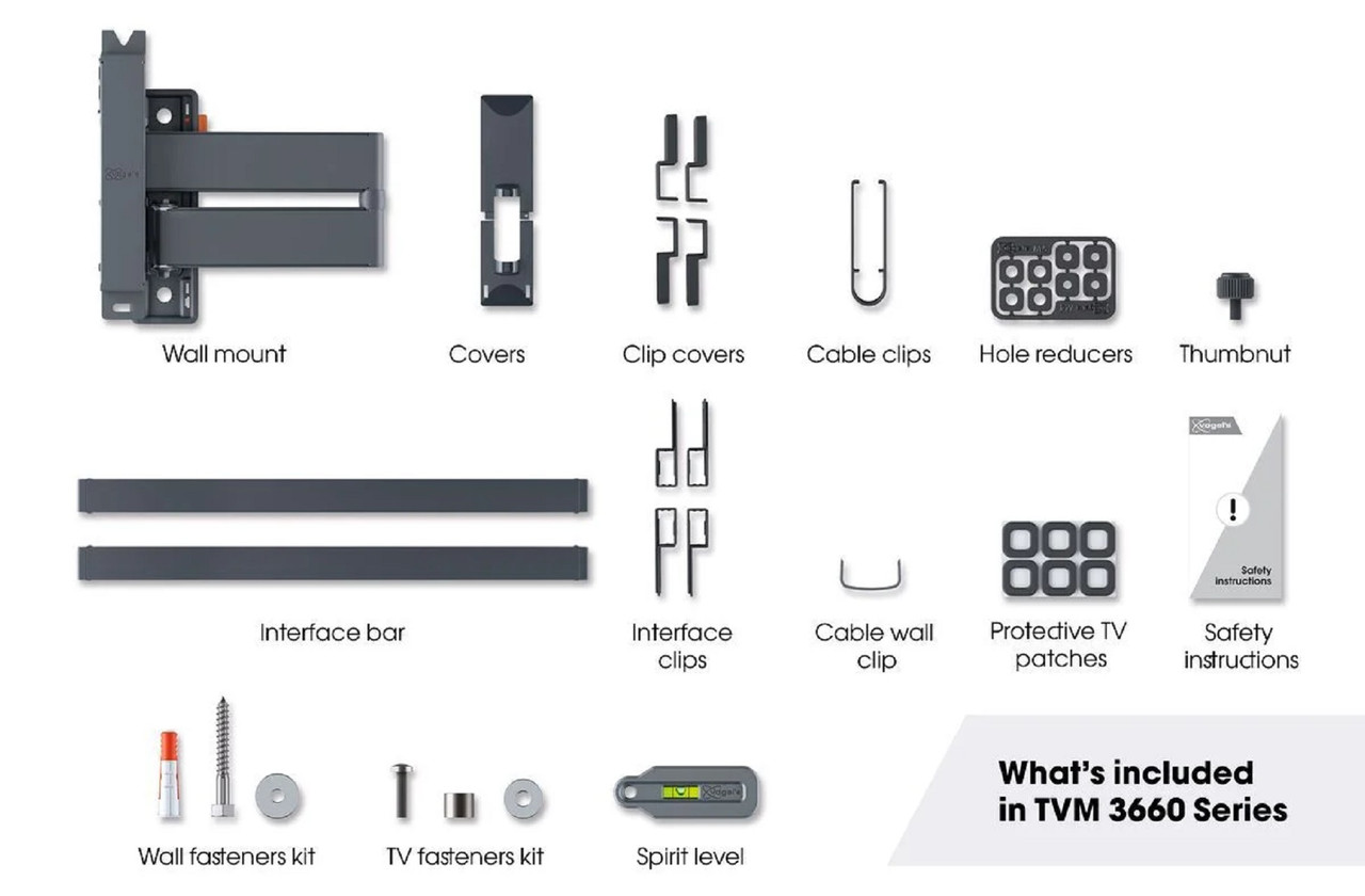 What’s in the box – Wall mount, Cable clips, Wall mounting kit with fischer® Duo Power plugs, TV fasteners kit, Protective TV patches, Spirit level, Quick Installation Guide, DrillRight™ AR app, Drilling template