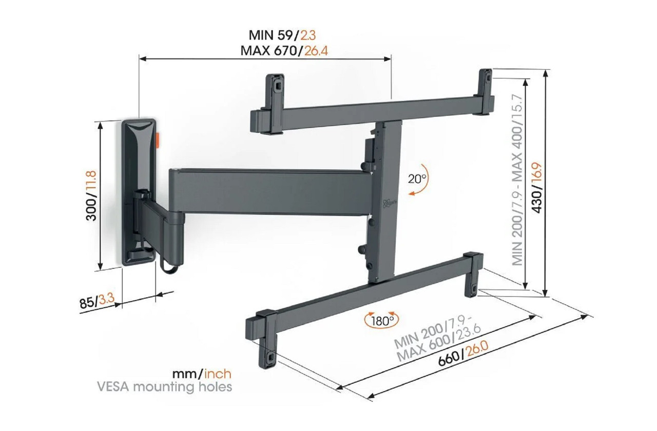 Compatible with the following VESA sizes – 200 mm x 200 mm, 200 mm x 300 mm, 300 mm x 200 mm, 300 mm x 300 mm, 400 mm x 200 mm, 400 mm x 300 mm, 400 mm x 400 mm, 500 mm x 200 mm, 500 mm x 300 mm, 500 mm x 400 mm, 600 mm x 200 mm, 600 mm x 300 mm, 600 mm x 400 mm